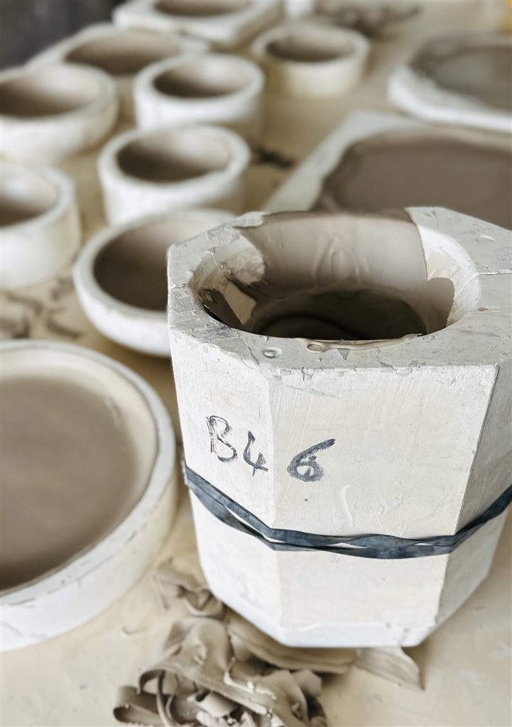 Dans le silence de l’atelier, nous sculptons nos moules à la main. Ce sont eux qui donnent à chaque pièce sa forme finale, tout en laissant à la matière la liberté de vivre. Fabriqués en plâtre, ils sont créés en plusieurs parties pour permettre un démoulage sans tension. C’est une étape minutieuse, où la technique épouse la création.
