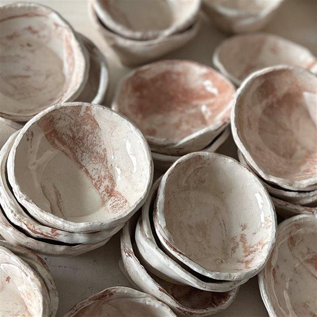 Travaillées à la main uniquement, elles sont le fruit de ce mélange de terre qui nous donne ses veines de couleurs rouges et blanches insolites et aléatoires, telles des marbrures.